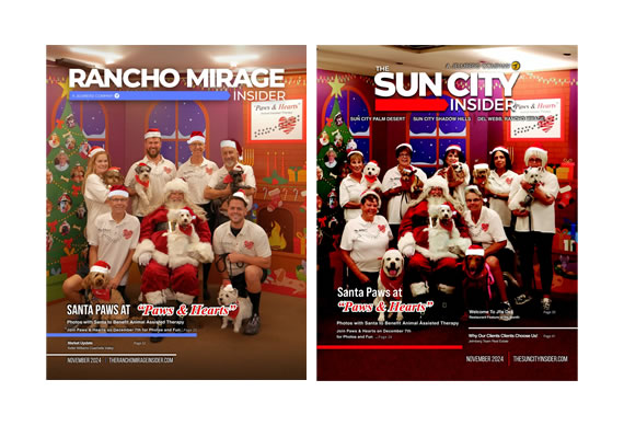 Desert Insider and Sun City Insider November 2024 issues feature "Paws & Hearts" on their covers promoting our Santa Paws event!